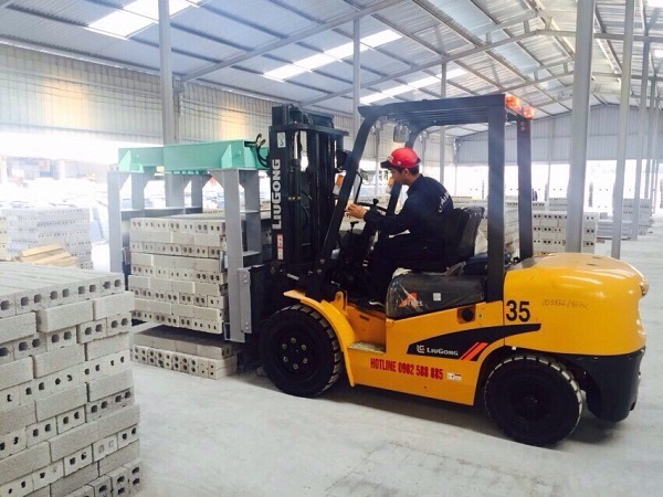 Người lái đang sử dụng càng xe nâng để nâng hạ hàng hóa